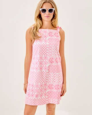- Straight fit shift dress with an apron neckline, bow detail at the shoulders, and side panels.