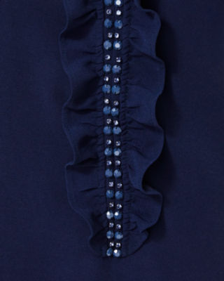 - Easy fit, popover dress with a ruffle collar, gold buttons, and 3/4 length sleeves with slits at the cuffs.