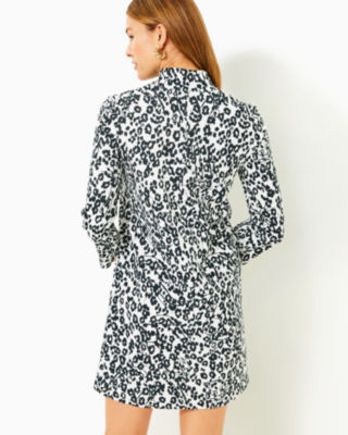 - Swing fit, long sleeve, tiered dress with a stand collar and side seam pockets.