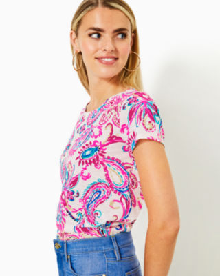 - Easy fit, short sleeve, pullover tee with a scoop neck.